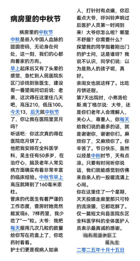 在治疗过程中,医护人员无微不至的关怀让葛先生深受感动。管床的代晓洁医生在查房时敏锐发现他漏服了一粒药,并细心在药盒上标注服用方法;护士们打针时耐心安抚,时刻关注他的需求;就连素不相识的年轻医护人员也主动问候,让前来探望的同学误以为是“熟人的孩子”。葛先生动情地写道:“亲闺女也就这样了。比吃月饼还甜。”
