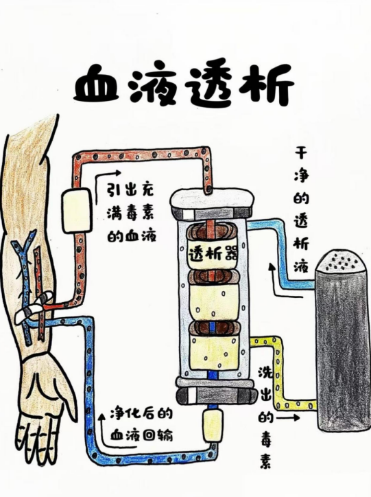 弥散:利用半透膜(透析器/人工肾)两侧的浓度差。血液在膜的内侧流动,外侧是特别配制的透析液。血液中高浓度的代谢废物(如尿素、肌酐)和多余电解质(如钾、磷)会透过膜上的微小孔隙,“扩散”到透析液中被带走;而透析液中人体需要的物质(如碳酸氢根)则能进入血液。