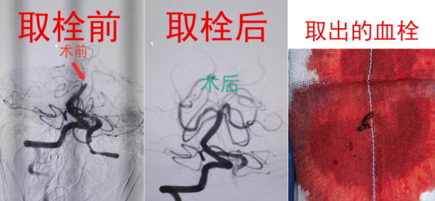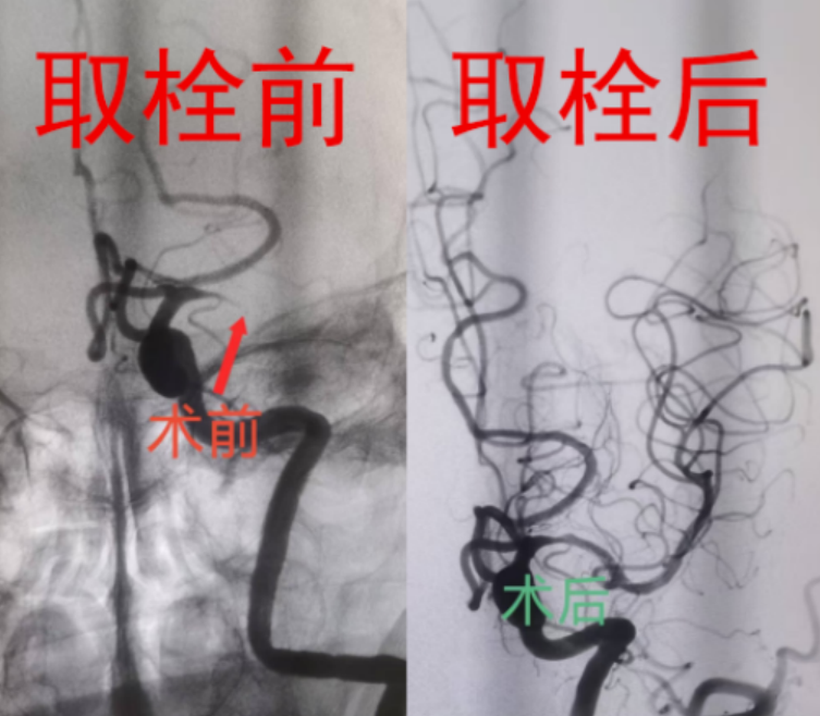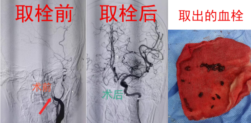 2025年10月13日,74岁的王女士突发右侧肢体无力2小时,完全不能动弹,伴左侧凝视和口角歪斜,被家属紧急送至虞城县人民医院卒中中心。医护人员立即启动绿色通道,完成头颅CT检查并排除禁忌症后,进行静脉溶栓。由于症状未见好转,卒中团队迅速与家属沟通并取得同意后,立即一键启动导管室行急诊手术。术中,医生为患者实施脑血管造影和经皮颅内动脉取栓术,成功取出一块暗红色血栓,实现血管再通。目前,患者已能够自行活动。