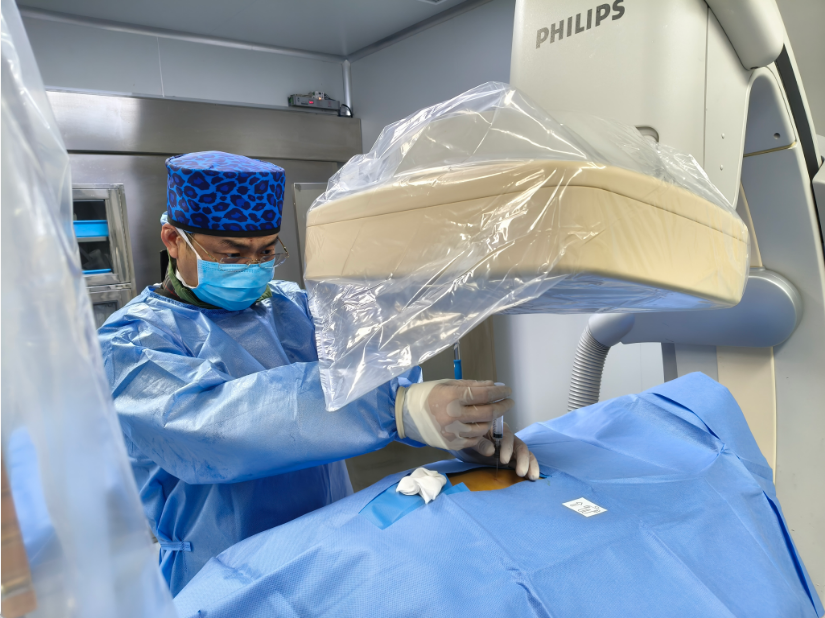 经家人介绍,父女二人慕名来到虞城县人民医院疼痛科,找到种建超医生。种医生在详细询问病史并完善相关检查后,决定为他们在介入手术室DSA引导下,施行“腰椎间盘突出胶原酶化学溶盘术”。