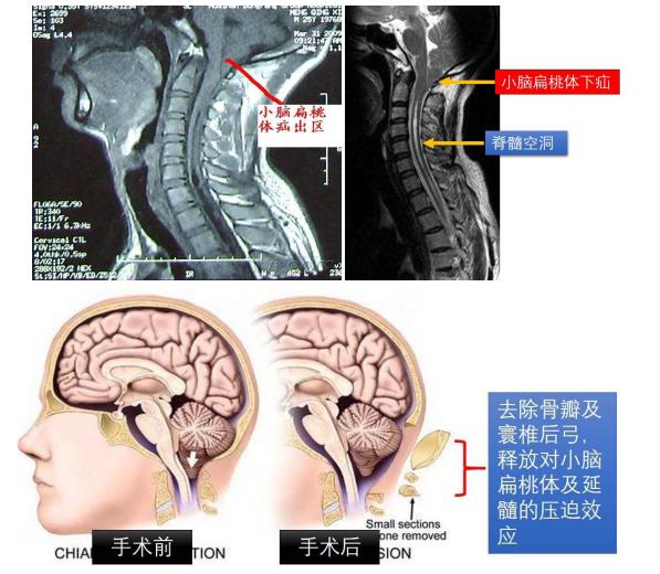 手术方式包括枕下开颅上颈椎椎板切除减压或脑脊液分流术。有人认为Ⅰ型可行枕下减压术,而Ⅱ型仅作分流术即可。一般作颅后窝充分减压术,即切除部分枕骨鳞部及第1或2颈椎椎板,切开硬膜并分离粘连,探查第四脑室正中孔对于有梗阻性脑积水手术未能解除者,可行脑脊液分流术。符合手术适应征的患者应及早行手术治疗。症状出现2年内手术治疗效果最好,疼痛常可在术后缓解,肢体力弱不易改善,尤其已有肌肉萎缩者;脊髓空洞影像学改善率可高达90%以上,相关症状缓解率可达60-70%。