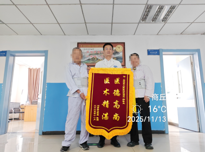 近日,在虞城县人民医院疼痛科,患者刘先生和他的女儿刘女士将一面饱含深情的锦旗,郑重地交到了种建超医生手中,感谢他和科室团队用精湛的医术,为他们解除了常年因腰椎间盘突出症带来的痛苦,让父女二人重获正常生活。